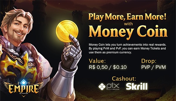 O Money Coin permite transformar suas conquistas em recompensas reais. Jogando PvM e PvP, você pode receber Money Tickets e usar como moeda premium.